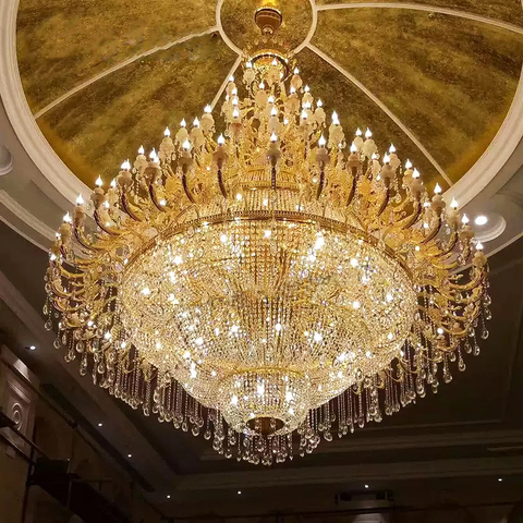 Candelabro LED de cristal dorado de lujo moderno para techo grande, candelabro de hotel de lujo moderno con control remoto para sala de banquetes
